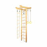 Сама стенка компактная: её высота составляет 231 см, а ширина всего 70 см. Расстояние от стены до стоек шведской стенки - 16 см. Расстояние между стойками диаметром 50 мм и толщиной 1,2 мм составляет 60,5 см, что является и шириной девяти перекладин диаметром 25 мм.